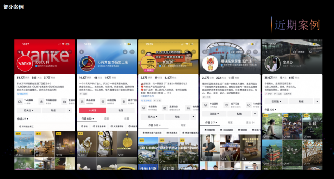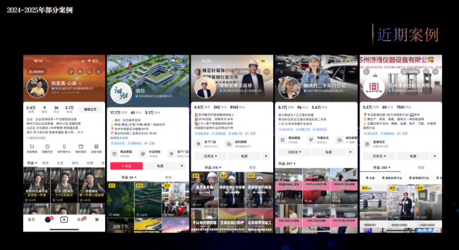 • 苏州芙蓉姐聊装修 / 常熟老黄谈装修:保量装修线索量完成率 150%,单账号最高 504.8 万获赞、146.4 万粉丝,成为苏州装修领域头部账号,精准获客效果显著; • 腾姨的二手车行日记:保量到店咨询量完成率 120%,现 3.6 万粉丝,8.1 万获赞,打造沉浸式二手车买卖内容,到店咨询量大幅提升。