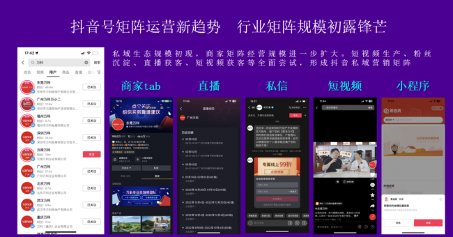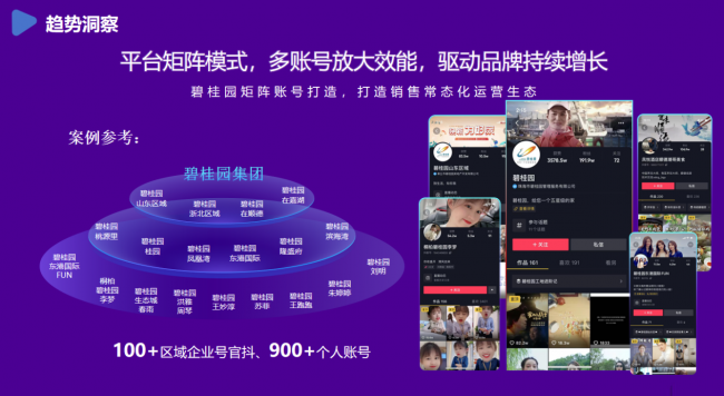 5. 矩阵运营思维,放大流量效能:深谙抖音账号矩阵运营新趋势,可通过多账号协同、内容分发、流量互导打造私域营销生态,像知名房企等品牌矩阵运营模式一样,实现流量规模化放大,驱动品牌持续增长,让保量效果最大化。