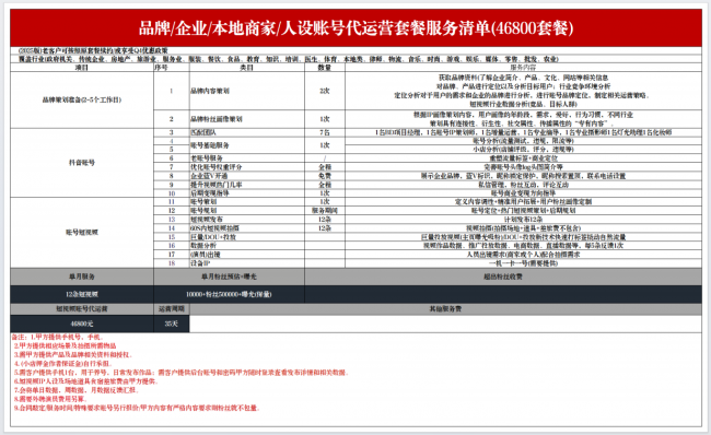 备注:以上价格均为基础服务费用,外聘演员、特殊拍摄场地、大额付费投流等费用另行计算,费用透明无隐形消费;小店押金、作者保证金等平台相关费用由客户自行承担,公司提供全程专业指导;若未完成协议约定的保量指标,将免费制定