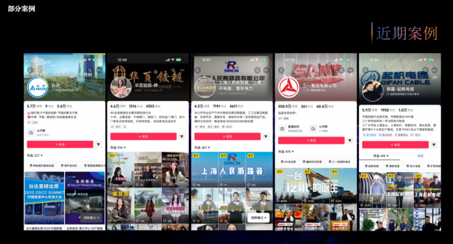 • 苏州谦通仪器设备:保量采购线索量完成率 130%,现 3.1 万粉丝,17.7 万获赞,将仪器设备技术参数转化为科普内容,精准触达采购人群,询盘量提升 60%+; • 华页铰链 / 上海电缆等工业品类:工业配件类账号,保量行业精准粉丝完成率 140%,单账号最高 3.4 万粉丝,5.7 万获赞,成为工业品类抖音内容标杆。